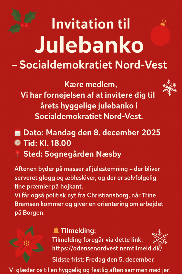 Vi har fornøjelsen af at invitere dig til årets hyggelige julebanko i Socialdemokratiet Nord-Vest.